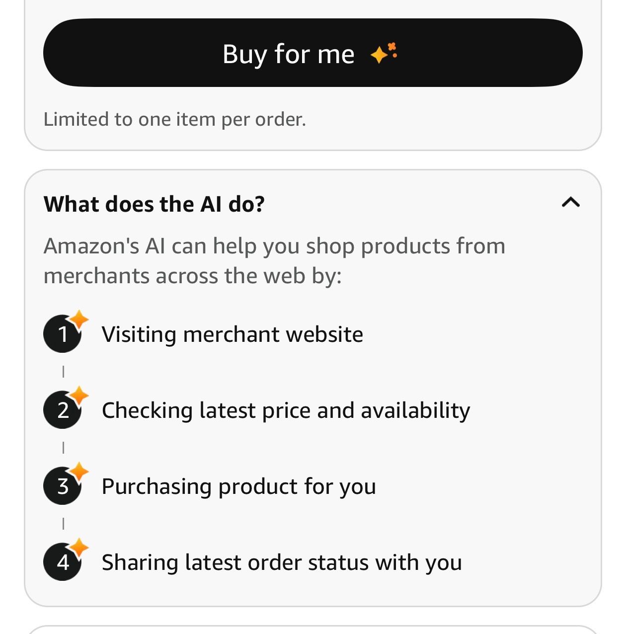 Amazon, it turned out, had been scraping their listings to include in its AI-powered shopping feature, Rufus. In addition to seeing products from Amazon, customers using Rufus were being shown items from outside stores, sometimes with a button labeled “Buy for me✨,” which would trigger an Amazon-powered bot to browse the outside merchant’s website, check the item’s price and availability, place the order, and handle the payment process.