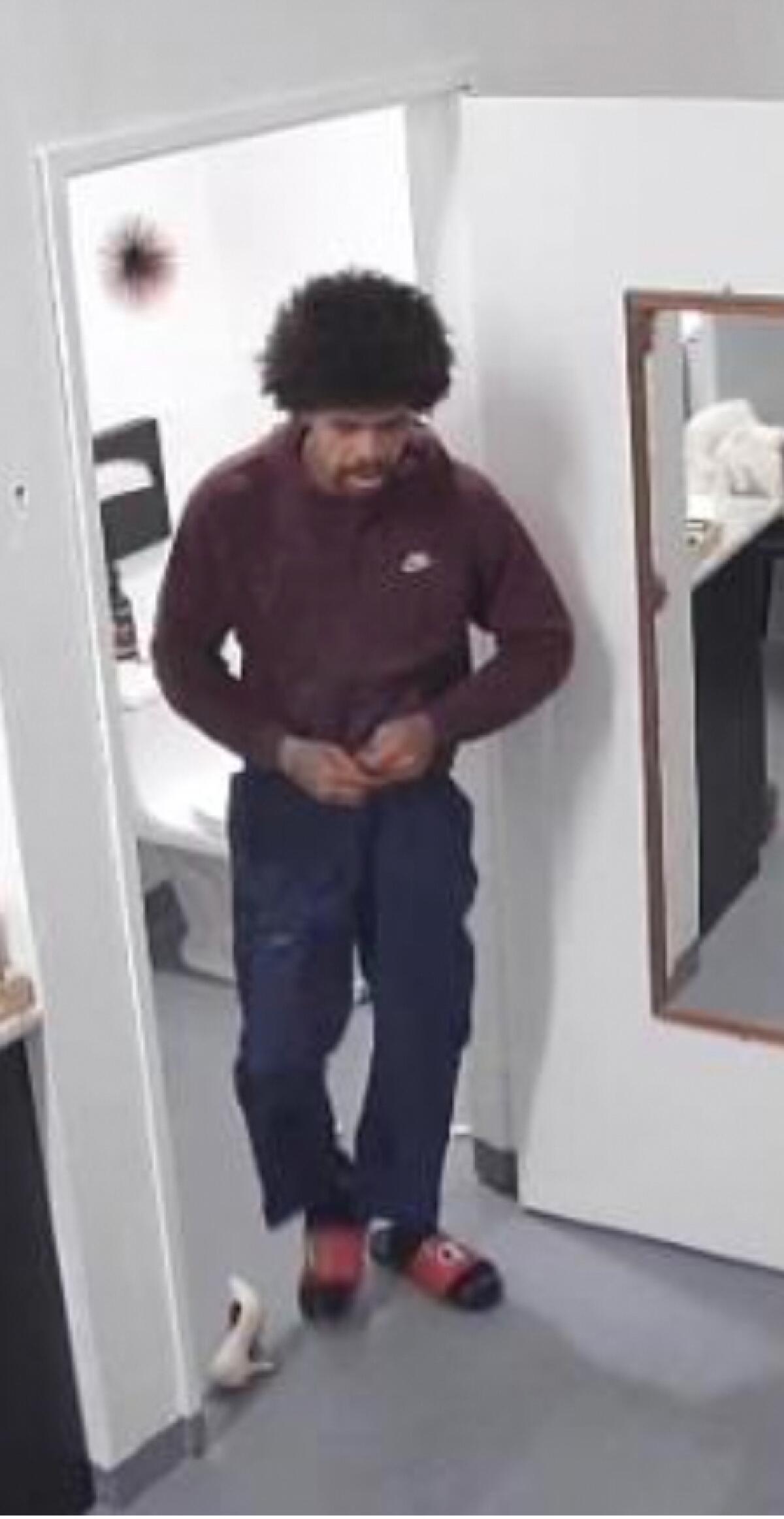 Davis is 6 foot 1 and weighs about 190 pounds. He was wearing a burgundy Nike sweater, blue pants and red sandals during the assault, police said.