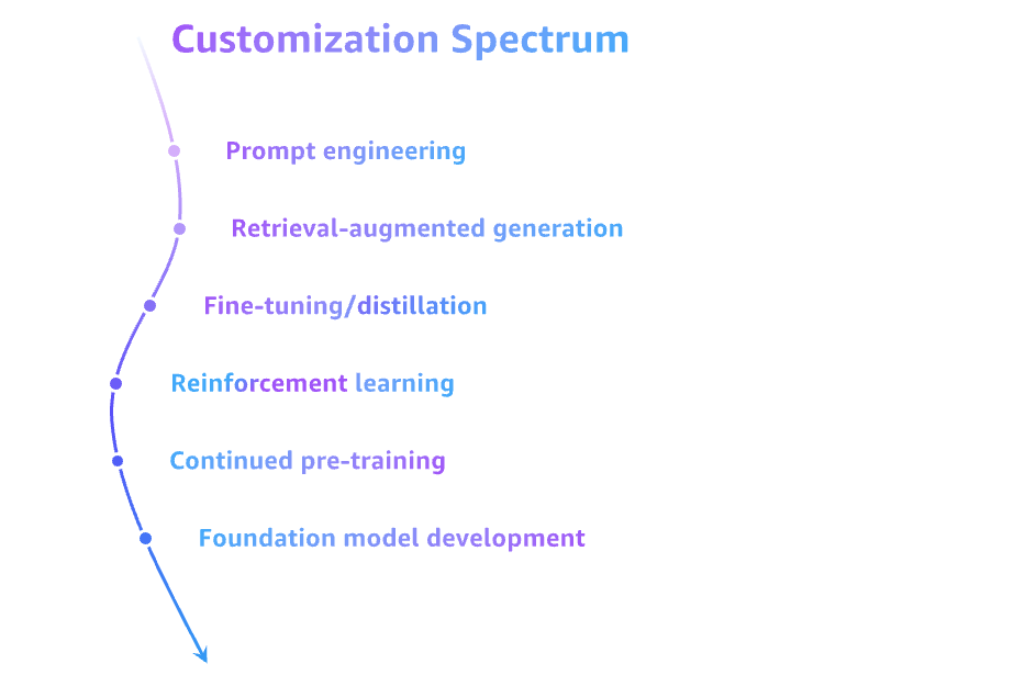 Customization options range from lightweight approaches like supervised fine-tuning to ground-up model development. We typically advise starting with lighter-weight solutions that require smaller amounts of data and compute, then progressing to more complex techniques only when specific use cases or remaining gaps justify the investment: