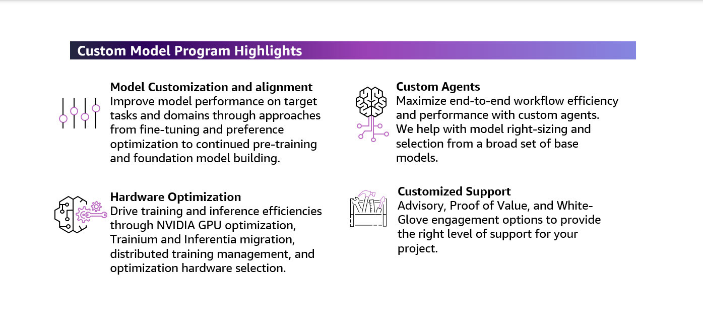 In 2024, we launched the Custom Model Program within the AWS Generative AI Innovation Center to provide comprehensive support throughout every stage of model customization and optimization. Over the past two years, this program has delivered exceptional results by partnering with global enterprises and startups across diverse industries—including legal, financial services, healthcare and life sciences, software development, telecommunications, and manufacturing. These partnerships have produced tailored AI solutions that capture each organization’s unique data expertise, brand voice, and specialized business requirements. They operate more efficiently than off-the-shelf alternatives, delivering increased alignment and relevance with significant cost savings on inference operations.