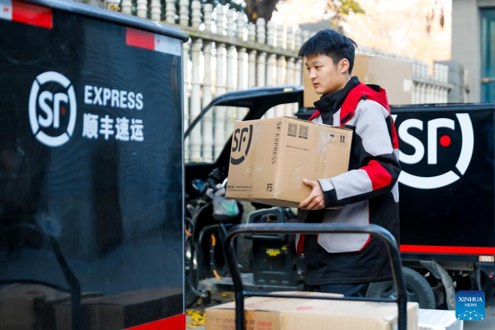 A deliveryman carries a package at a branch of courier service provider SF Express in Wuzhi County, central China’s Henan Province, Nov. 11, 2025. E-commerce and logistics companies across China are working at full capacity during the annual “Double Eleven” shopping festival. (Photo by Wang Linfeng/Xinhua)