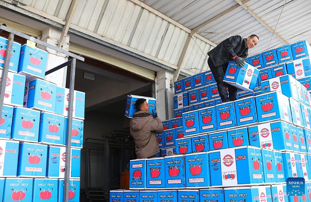 Staff members load boxed apples for sale at an industrial park in Jingning County of Pingliang City, northwest China’s Gansu Province, Nov. 11, 2025. E-commerce and logistics companies across China are working at full capacity during the annual “Double Eleven” shopping festival. (Photo by Wang Yi/Xinhua)