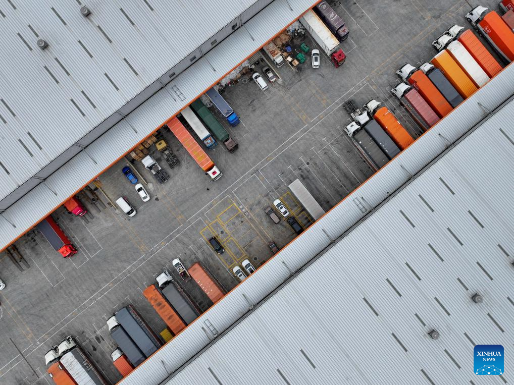 This aerial drone photo taken on Nov. 11, 2025 shows trucks unloading goods at a logistics park in Longli County, southwest China’s Guizhou Province. E-commerce and logistics companies across China are working at full capacity during the annual “Double Eleven” shopping festival. (Photo by Yuan Fuhong/Xinhua)