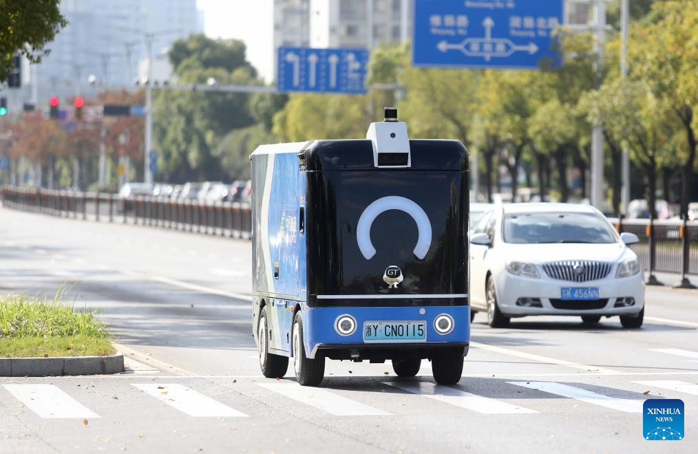 A self-driving delivery vehicle transports packages in Yangzhou City, east China’s Jiangsu Province, Nov. 11, 2025. E-commerce and logistics companies across China are working at full capacity during the annual “Double Eleven” shopping festival. (Photo by Meng Delong/Xinhua)