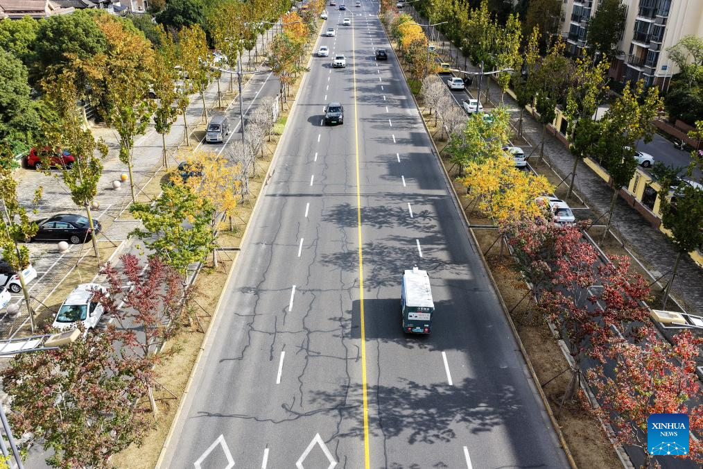 This aerial drone photo taken on Nov. 11, 2025 shows a self-driving delivery vehicle transporting packages in Yangzhou City, east China’s Jiangsu Province. E-commerce and logistics companies across China are working at full capacity during the annual “Double Eleven” shopping festival. (Photo by Meng Delong/Xinhua)