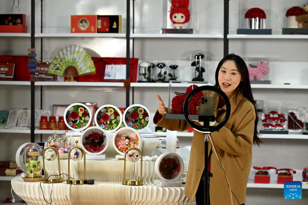 A staff member promotes products via live-streaming at a culture and tourism industrial demonstration base in Shijiazhuang City, north China’s Hebei Province, Nov. 11, 2025. E-commerce and logistics companies across China are working at full capacity during the annual “Double Eleven” shopping festival. (Photo by Chen Qibao/Xinhua)