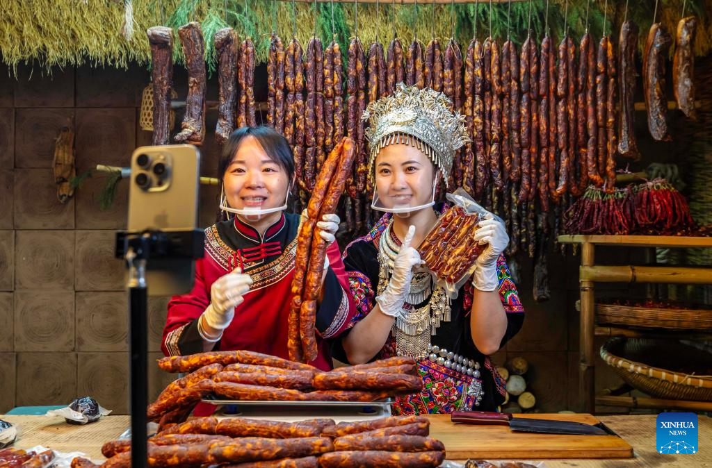 Staff members promote agricultural products via live-streaming in Qianxi City, southwest China’s Guizhou Province, Nov. 11, 2025. E-commerce and logistics companies across China are working at full capacity during the annual “Double Eleven” shopping festival. (Photo by Fan Hui/Xinhua)