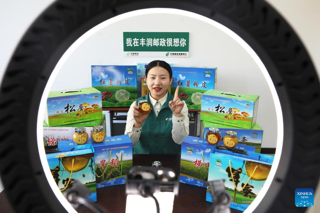 A staff member promotes local agricultural products via live-streaming at a branch of China Post in Tangshan City, north China’s Hebei Province, Nov. 11, 2025. E-commerce and logistics companies across China are working at full capacity during the annual “Double Eleven” shopping festival. (Photo by Zhu Dayong/Xinhua)