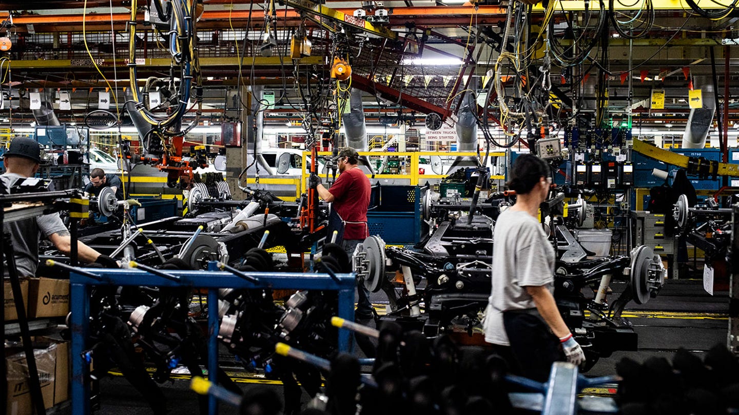 Workers assemble chassis parts for vehicle frames at the General Motors assembly plant in Fort Wayne, Indiana. ( Emily Elconin/Bloomberg via Getty Images)