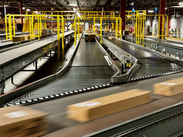 Items are then sent upstairs to a network of conveyor belts that guide each box to the correct truck.