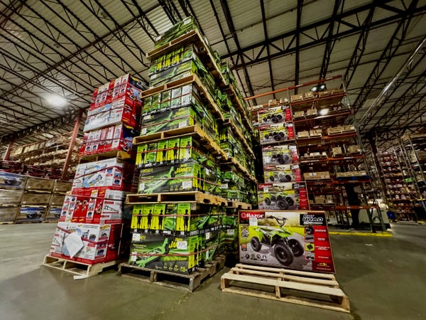 Here, pallets of Mario Kart racing toys are stacked next to electric scooters and kid-sized four-wheelers.