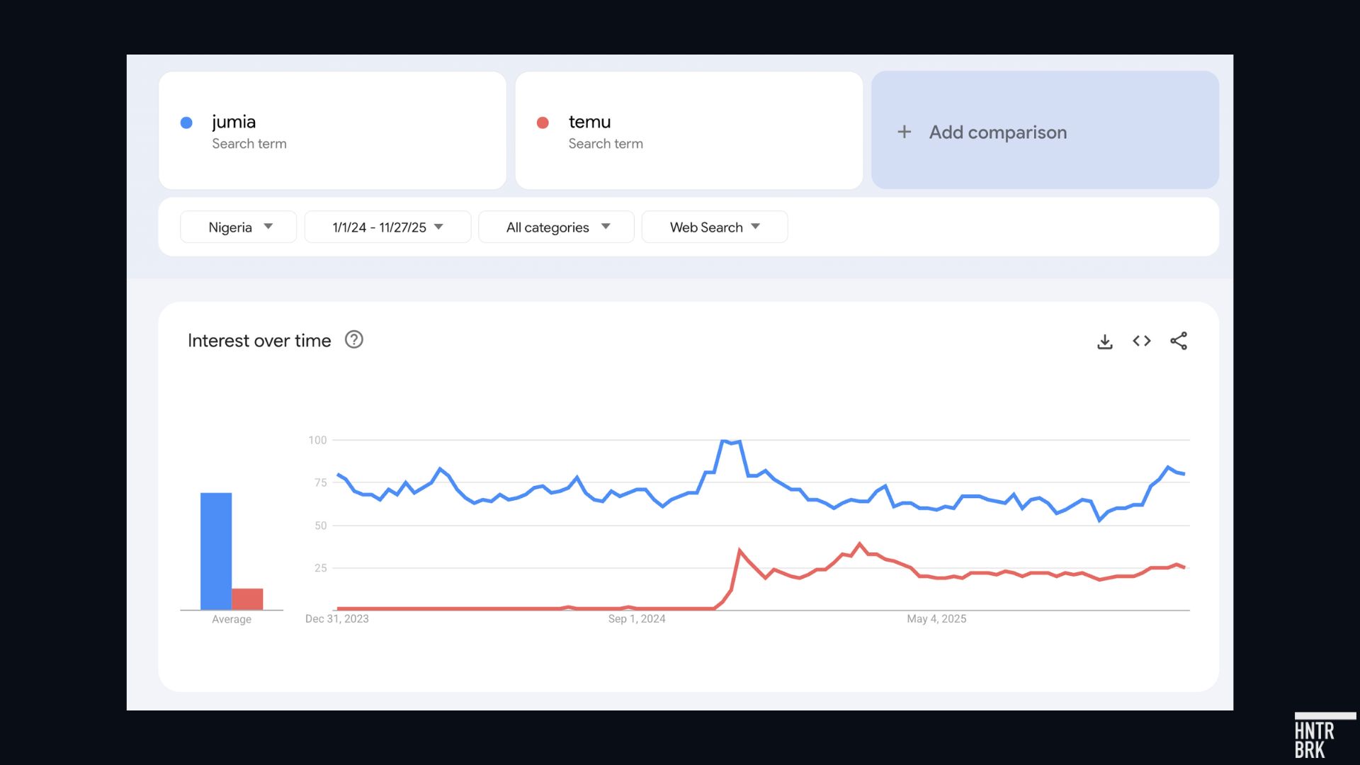 Google trends comparison in searches between Jumia and Temu in Nigeria\