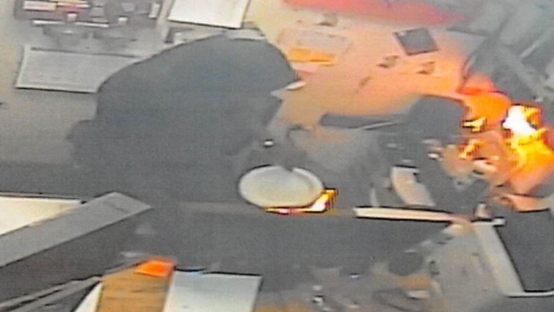 Photos from the arrest affidavit show Bailey “actively” setting fire in the office area of Sportsbook. A still frame taken from video shows Bailey lighting several paper plates on fire and then using them to set fires in several places.