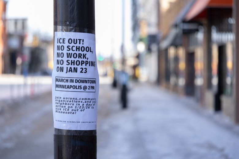 A sign on a light pole in Minneapolis on Jan. 23, 2026, promotes the ICE Out protesting federal immigration operations in Minnesota. Credit: Chris Juhn for Sahan Journal
