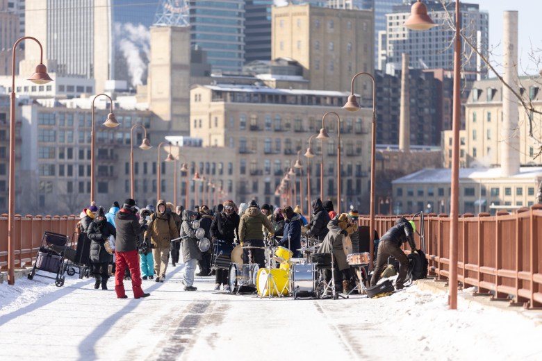 Drummers pack up after a performance on the Stone Arch Bridge in Minneapolis on Jan 23, 2026, protesting federal immigration operations in Minnesota. Credit: Chris Juhn for Sahan Journal