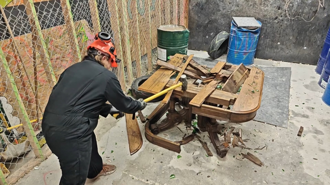 The venue serves as stress relief for those tired of office work. “If you ever get tired of sitting behind a desk, this is the place for you,” said reporter Jeff Zevely, who then smashed a desk.
