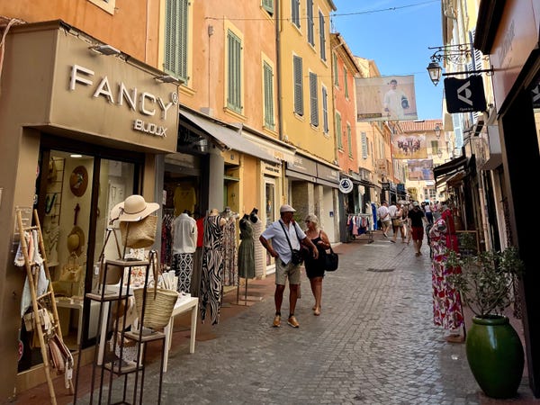 Narrow cobbled streets full of chic boutiques snake up from the harbor, dotted with tropical palm trees and pastel-colored buildings with blue and green shutters that offer traditional Provençal charm.