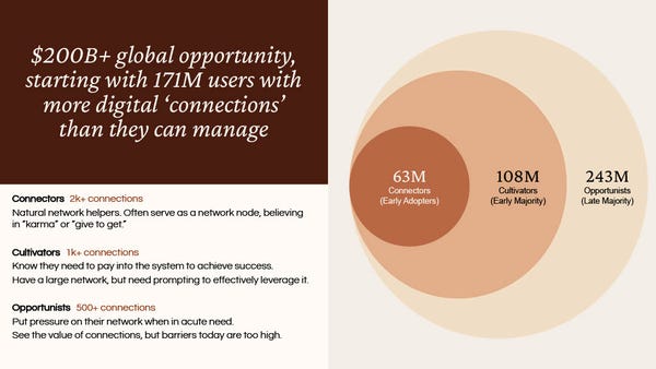 Opportunists — 500+ connections: Put pressure on their network when in acute need. See the value of connections, but barriers today are too high.