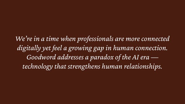 “We’re in a time when professionals are more connected digitally yet feel a growing gap in human connection,” the slide says. “Goodword addresses a paradox of the AI era — technology that strengthens human relationships.”