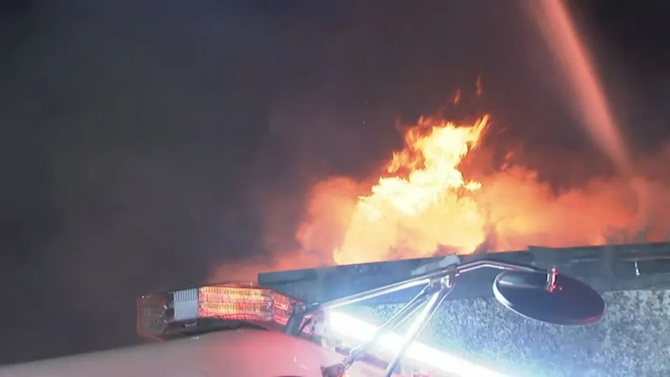The fire broke out around 8 p.m. Monday and reached three alarms, prompting a massive emergency response.