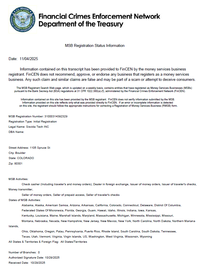 Timothy Harris emphasized that the MSB registration represents only one component of Sisvida’s broader multi-region compliance agenda. He noted that the company will continue advancing its responsible innovation framework, prioritizing enhanced auditability, stronger operational resilience, and more seamless interoperability across regulatory jurisdictions.