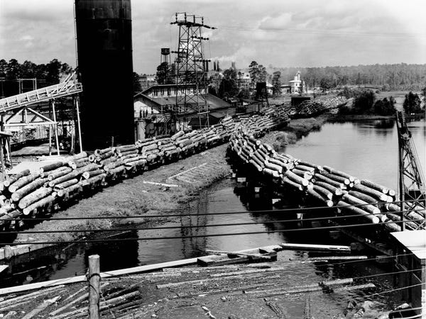 Lumber operations are pictured in Crossett, Arkansas, in the 1920s.