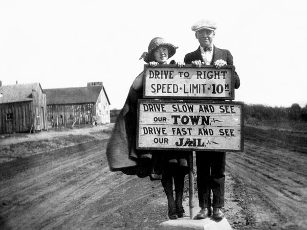 Pictured in Cordell, Oklahoma, in 1920, two people pose by a sign that discourages speeding.