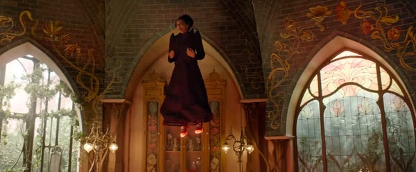 Thanks to her emotional connection to Elphaba, Glinda’s efforts are particularly effective. The movie illustrates this by recalling old cues and touchpoints from their journey in Act I, including choreography from the Ozdust Ballroom scene. Glinda even repeats a few of Elphaba’s key lines from “Defying Gravity.” (“Think of what we could do. Together.”)