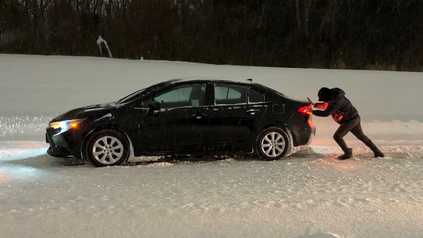 A man pushes his car amidst snowfall as Winter Storm Fern leaves drivers stranded in Tulsa, Oklahoma, on Jan. 25, 2026, in this screen grab from video.  (Eric Cox/Reuters / Reuters)